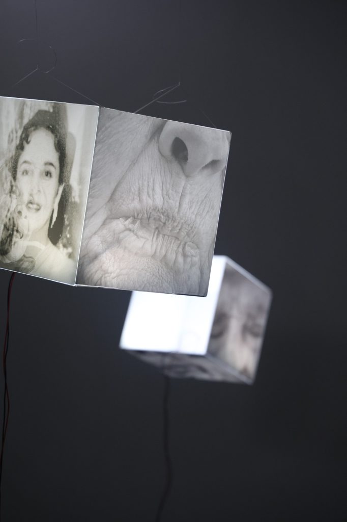 Isa Viveros armó en el sinfín un paisaje de cubos iluminados. Cubos como pequeñas arquitecturas mínimas, cuyas caras cargaban retratos: propios, ajenos, de archivo, encontrados, heredados. Un sistema eléctrico —una maraña de cables que parecía más una escultura que una instalación técnica— encendía unos, apagaba otros, produciendo una especie de respiración luminosa. Entre los cubos se abría un espacio transitable, una suerte de arboleda artificial hecha de imágenes.