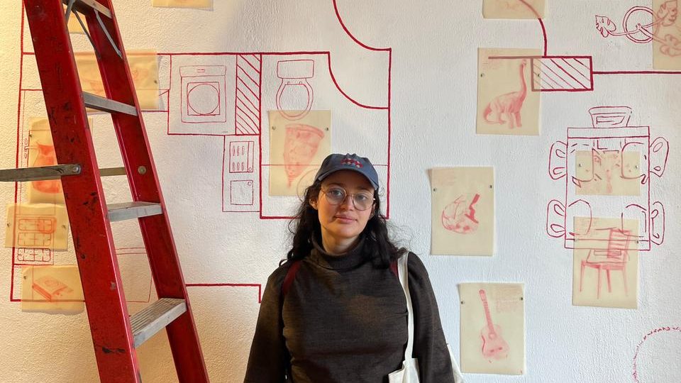 Sandra Lesmes hace algo que el Departamento suele mirar con sospecha: hablar desde el yo. Un montón de cosas parte de su propio apartamento: objetos cotidianos, clasificados por espacio, dibujados en esfero rojo sobre papel traslúcido. En diálogo con los cuadros de su abuela, les inscribe su historia por el reverso.