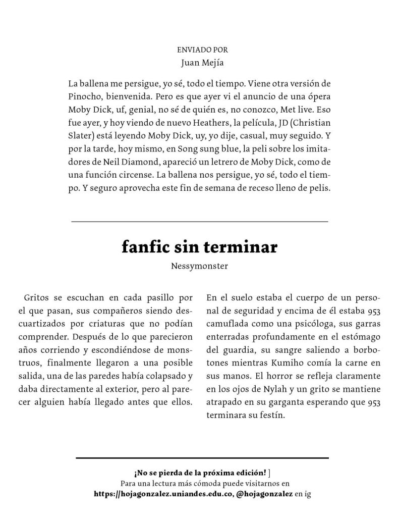 La ballena me persigue, yo sé, todo el tiempo. Viene otra versión de Pinocho, bienvenida. Pero es que ayer vi el anuncio de una ópera Moby Dick, uf, genial, no sé de quién es, no conozco, Met live. Eso fue ayer, y hoy viendo de nuevo Heathers, la pelÃcula, JD (Christian Slater) está leyendo Moby Dick, uy, yo dije, casual, muy seguido. Y por la tarde, hoy mismo, en Song sung blue, la peli sobre los imitadores de Neil Diamond, apareció un letrero de Moby Dick, como de una función circense. La ballena nos persigue, yo sé, todo el tiempo. Y seguro aprovecha este fin de semana de receso lleno de pelis.